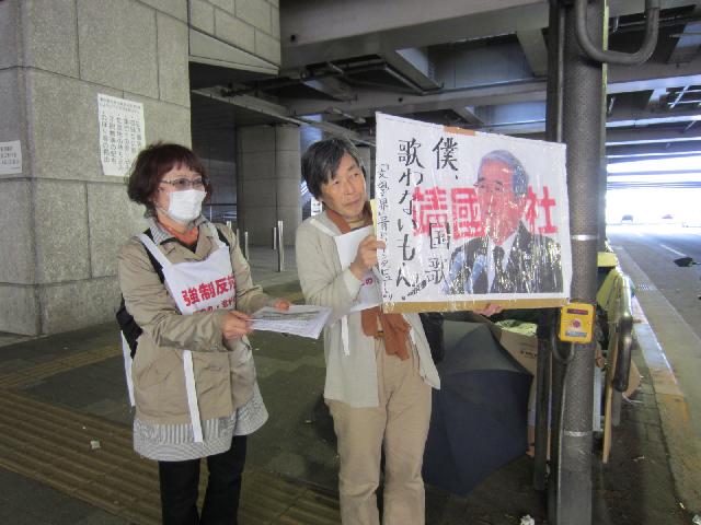 チラシの受け取りはあまりよくありませんでしたが、4月4日の「再発防止研修」抗議行動の際に使った「僕、国歌歌わないもん」と石原慎太郎の写真の入ったプラカードを掲げチラシまきをしたところ、多くの職員が目を止めていました。
